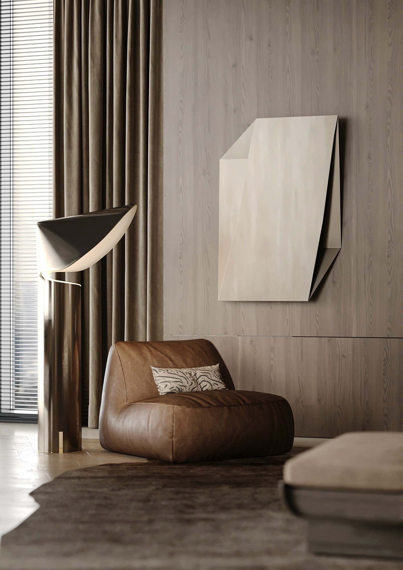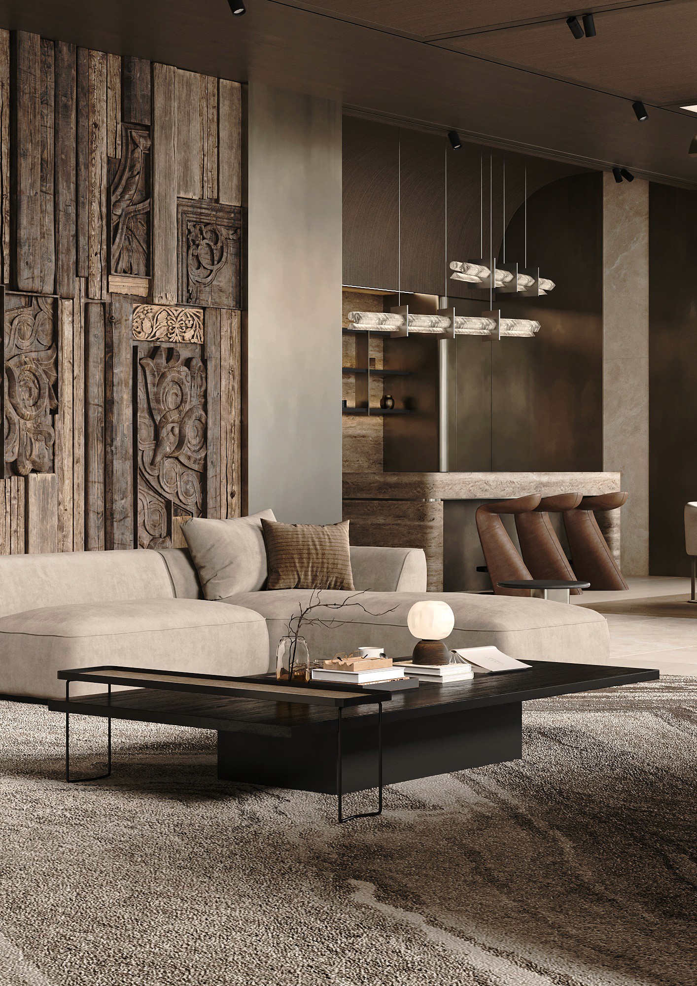 In this project, we used natural wood veneers on ceilings and walls, handcrafted bas-reliefs with thematic designs, natural parquet flooring, travertine in the bathroom, stone, and metal details. The apartment features radial surfaces, sculptural lighting, Italian furniture and fixtures, and a careful combination of materials and textures to create a sophisticated, highly luxurious, and cohesive interio