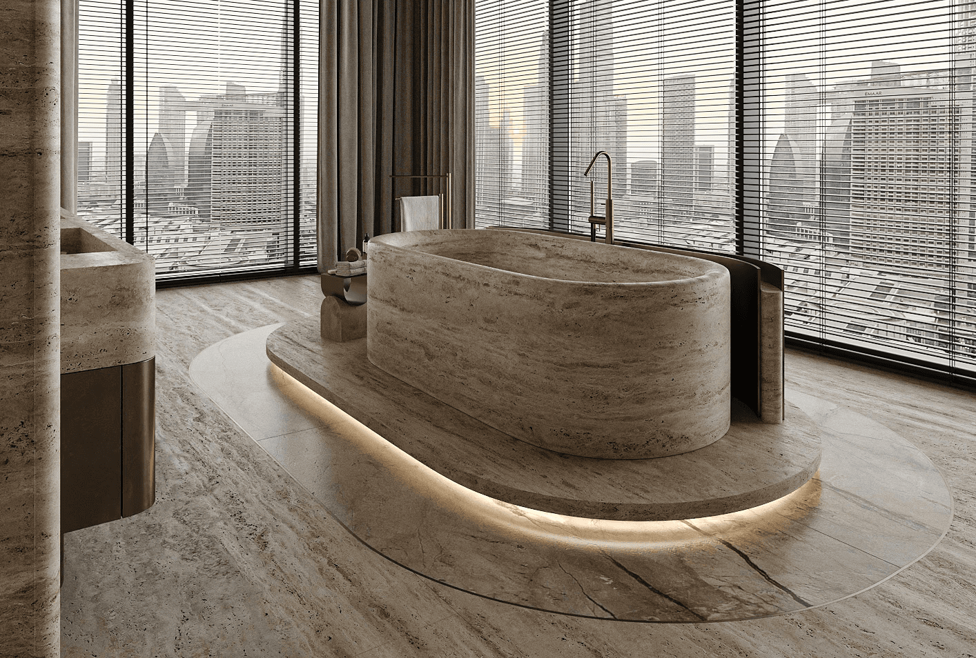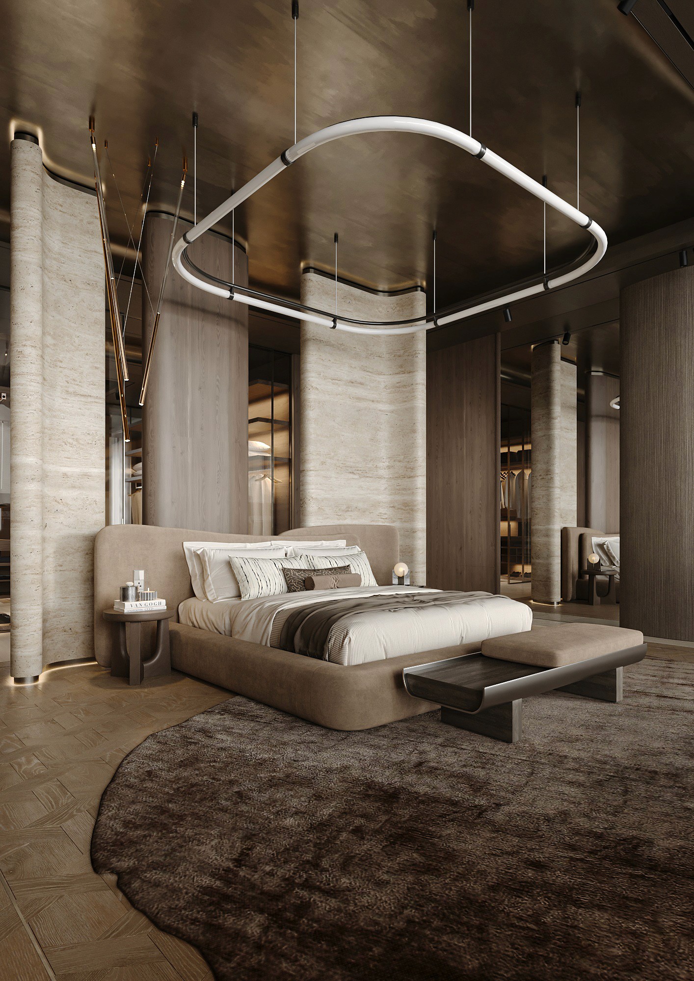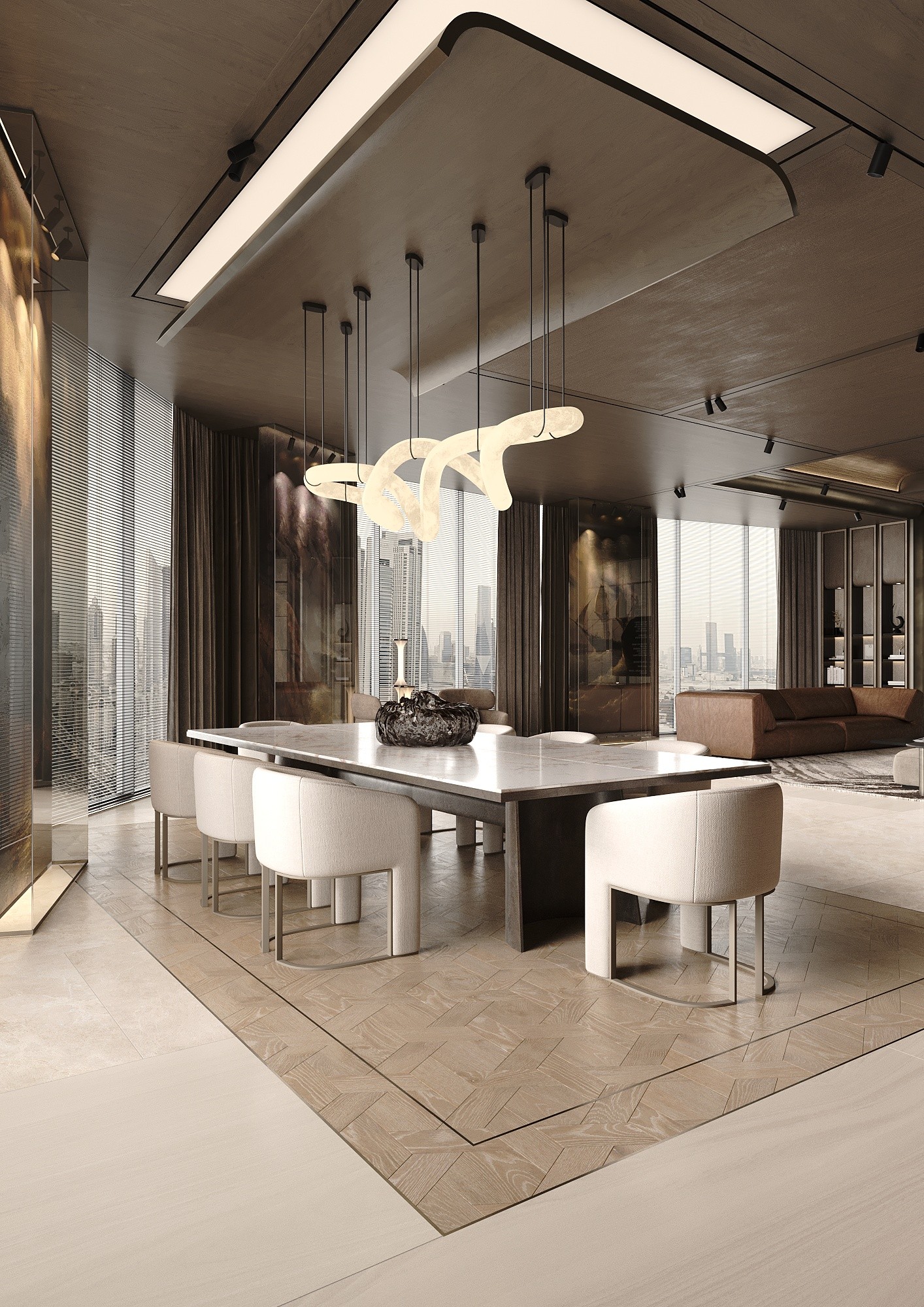 This ultra-luxury penthouse in Dubai was designed for a young client seeking a refined, exclusive home. The penthouse layout includes an open-plan living and dining area and a Primary Bedroom suite with a walk-in wardrobe. Panoramic windows frame stunning city views and fill the space with natural light. In this project, we used natural wood veneers on ceilings and walls, handcrafted bas-reliefs with thematic designs, natural parquet flooring, travertine in the bathroom, stone, and metal details. The apartment features radial surfaces, sculptural lighting, Italian furniture and fixtures, and a careful combination of materials and textures to create a sophisticated, highly luxurious, and cohesive interio